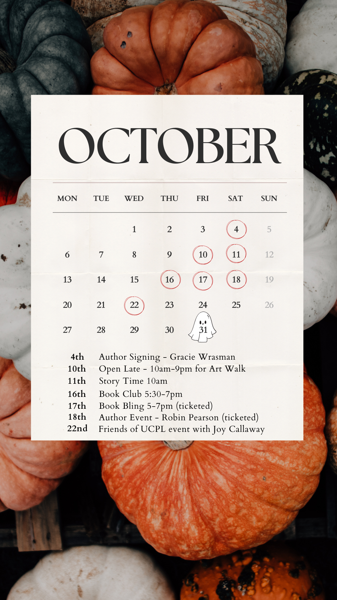 We have many events this month including pop ups and story times. There are also events in Downtown Monroe.