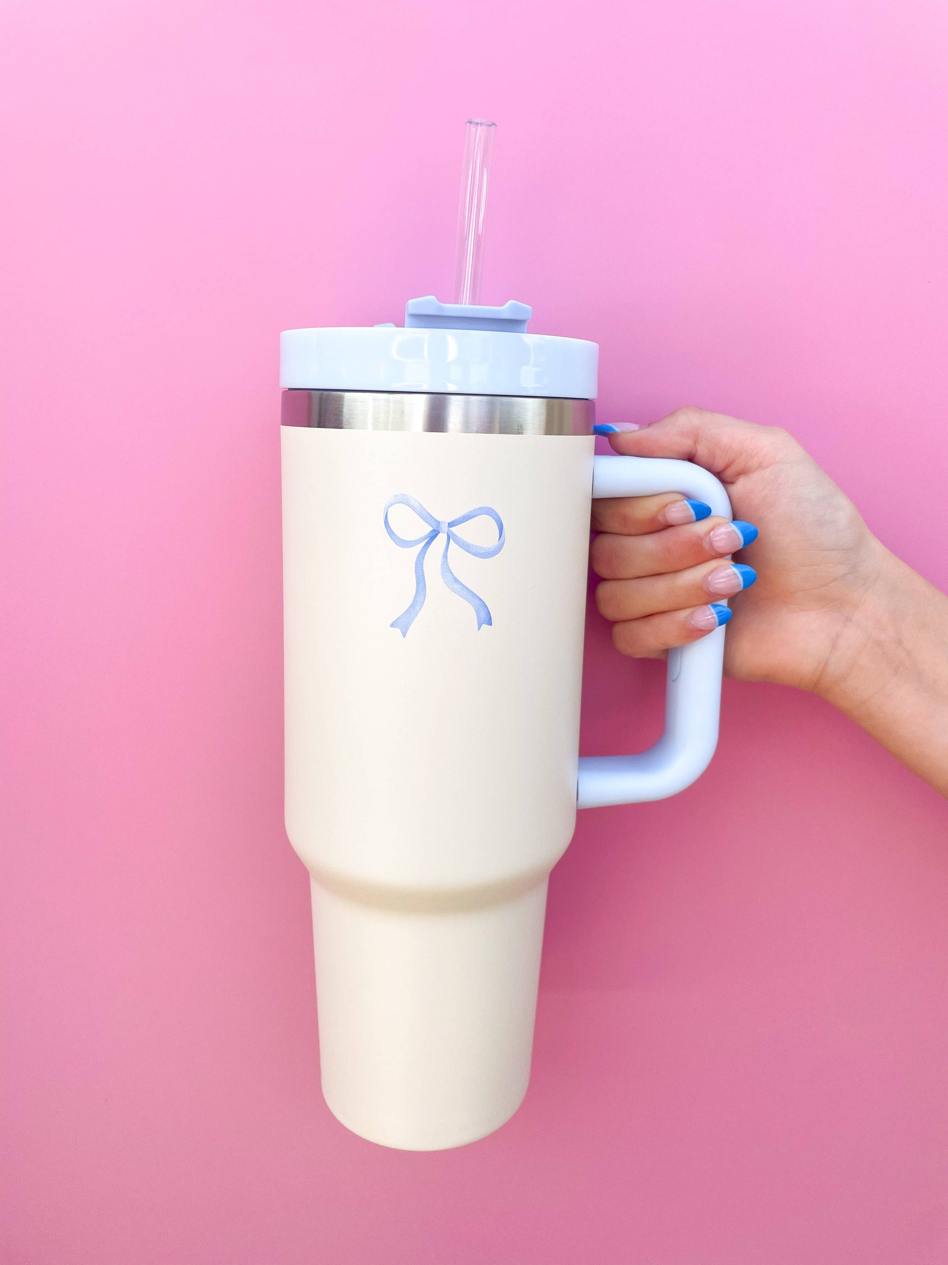 Stay hydrated with this 40 oz. Blue Bow Tumbler. The stainless steel lining keeps your drinks hot or cold all day long. The easy-grip handle and narrow base make it perfect for on-the-go.