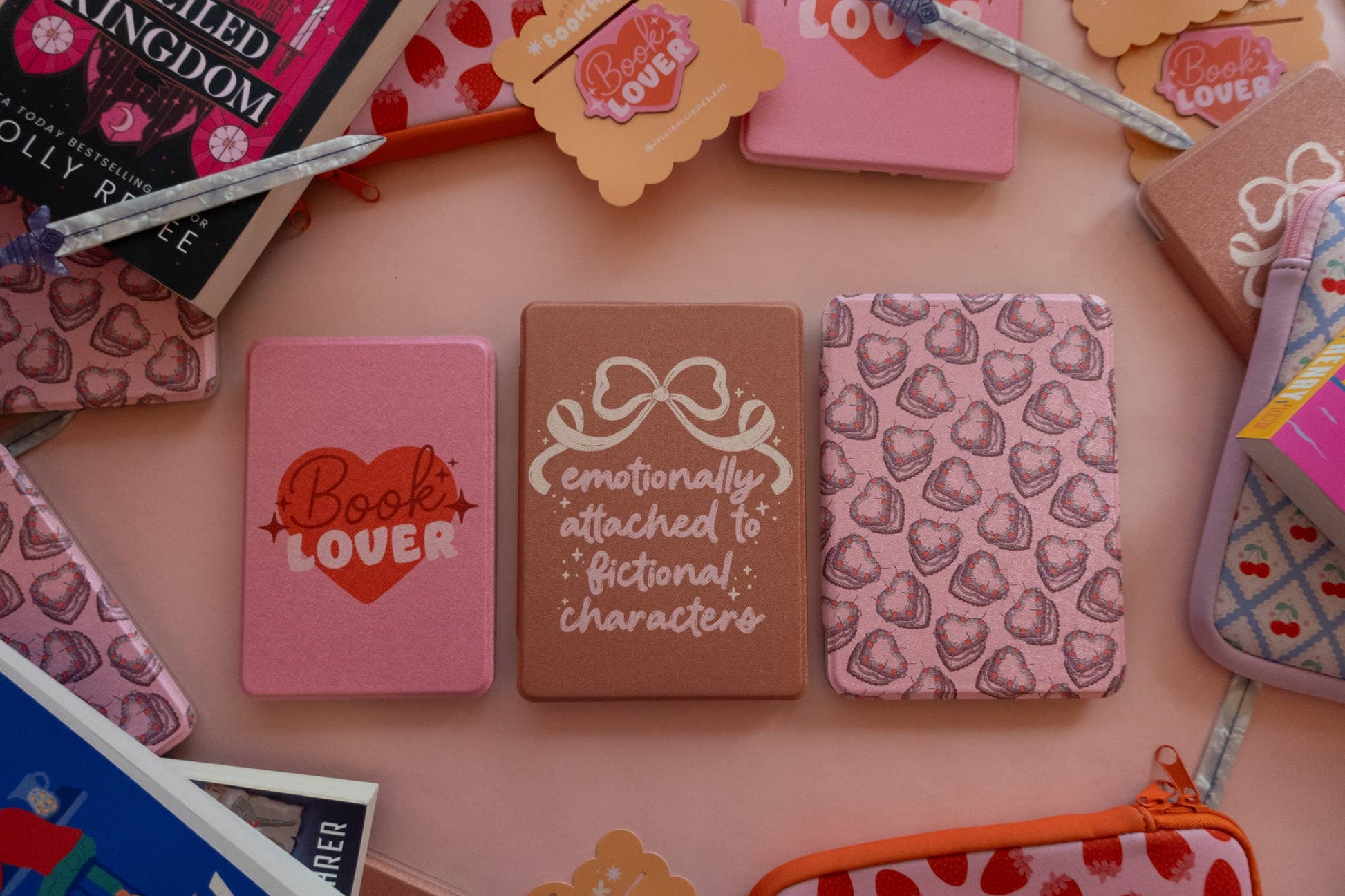 A cute little kindle case that says "Emotionally Attached to Fictional Characters" in cute pink lettering.