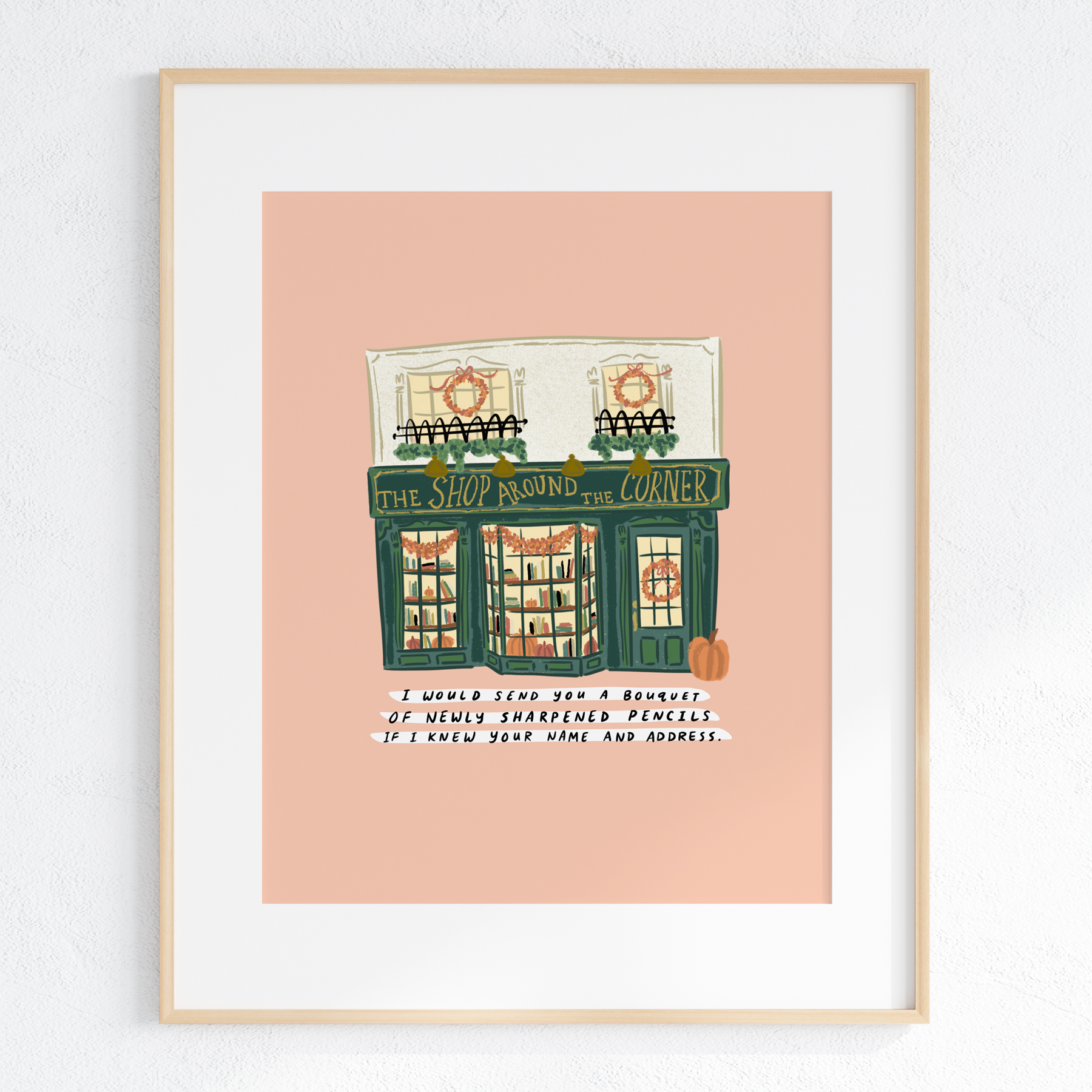 Beautiful illustrated fall art print featuring The Shop Around the Corner. Quote reads "I would send you a bouquet of newly sharpened pencils if I knew your name address." Perfect book lover gift!