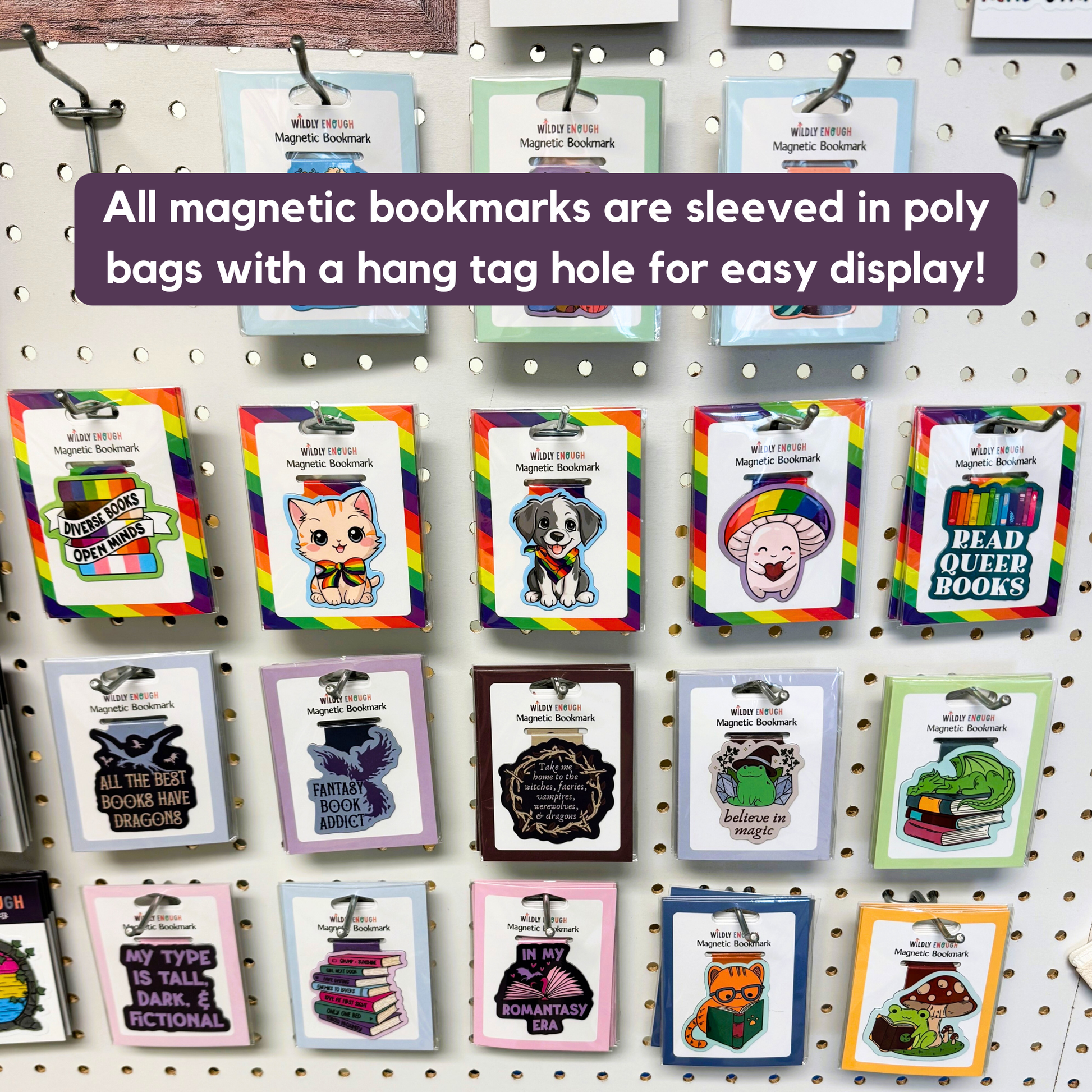A magnetic bookmark featuring a stack of books titled with some of your favorite romance tropes - from enemies to lovers and only one bed to fake dating!