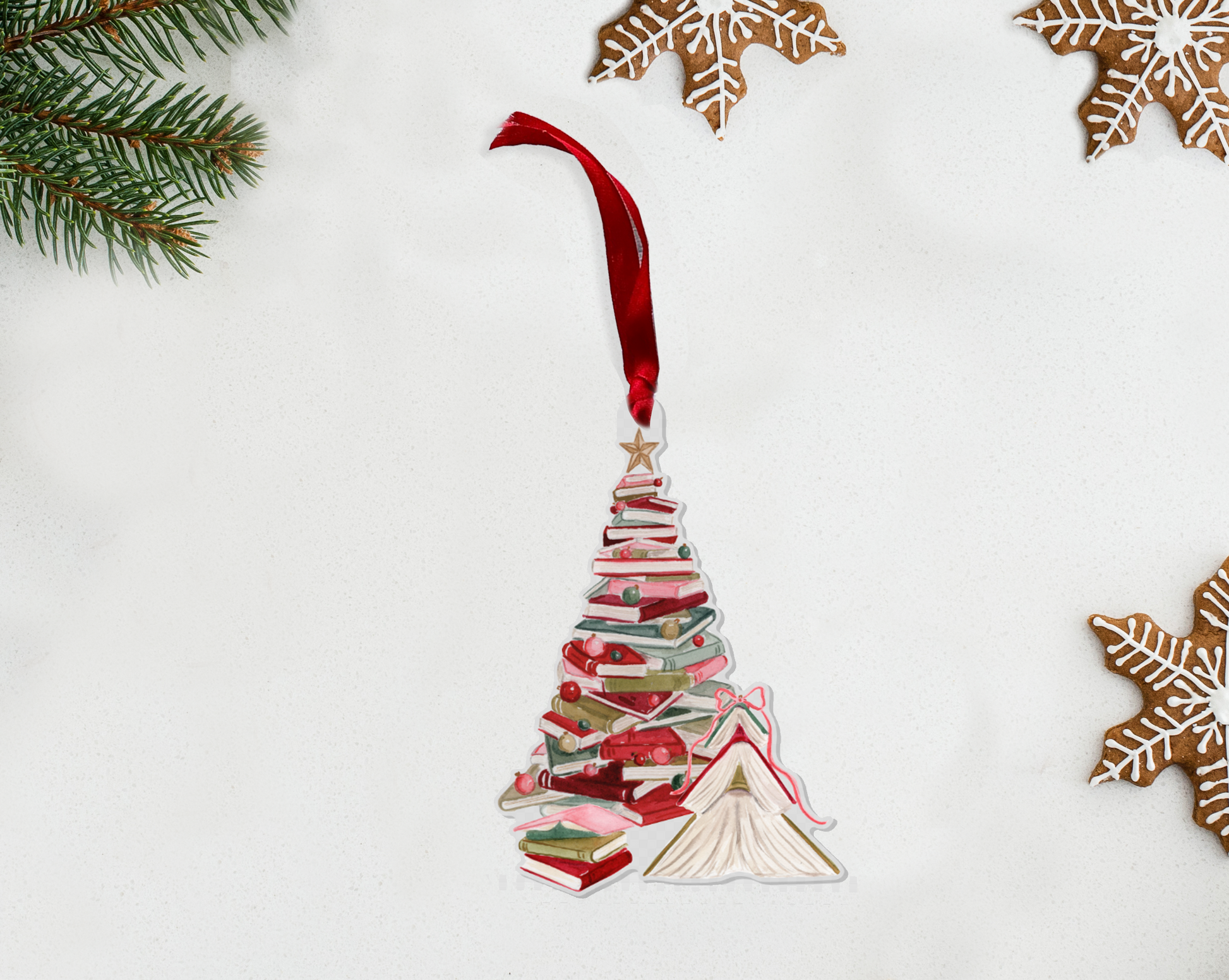 Trim the tree with an extra special ornament this year! This chic acrylic ornament features our hand-painted watercolor design of a Christmas tree made of books. Perfect for the book lover!